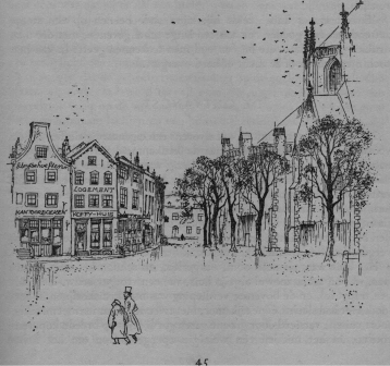 en had onder den arm een versleten portefeuilletje, waarin de boeken van een of ander leesgezelschap werden rondgebracht. 'Ik moest een boodschap voor meheer doen,' zei het mannetje, dat ik voor ongeveer achtenzestig aanzag, `en nu zei meheer, dat ik meteen reis na' de dullezan zou gaan, om te kijken of meheer alleronmenschelijkste beul zou moeten wezen, om `t iemand kwalijk te nemen dat hij u niet ke gekommen was.Uwé moet niet kwalijk nemen dat ik uwé niet trekt kon.' Nu, daar men dent, indien hij u nooit zijn dagen gezien heeft, schonk ik den goed en diaconieburger op dit punt een volkomene vergiffenis, liet mijn koffertje, totdat het afgehaald worden zou, in de `Rustende Moor', en sukkelde met mijn nieuwen kennis naar het huis mijns ooms; onder het faveur van onderweg vriendelijk door hem onderricht te worden aangaande het doel van een groot gebouw met gotische deuren en vensters, waarop een toren met ordentelijke omgangen, appel en weerhaan, `t welk hij zeide `de kerk' te wezen; als ook omtrent een breede streep groenkleurig vocht tusschen twee hooge gemetselde wallen, `t welk hij verklaarde `de gracht' te zijn. `En dit is het huis,' zeide hij, zijne oude beenen op een stoep zettende en een goeden ruk aan een lange schel gevende, met die uitdrukking van gelaat, die bij een oud man te kennen geeft: ik kan het toch niet hooren of ze zacht of hard overgaat.
