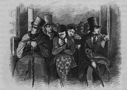 zat een knorrig, groot, dik man, dien ik zelf niet dorst doet te spreken, want hij had twee jassen over elkaar aan, een dikken rotting in de hand, een kleur als of hij zoo pas van een vechtpartij kwam, en een uitdrukking even alsof zij zich gereed maakte met den eersten die hem toesprak een verchtpartij te beginnen; 't was ongetwijfeld een commissaris van politie, of een plaatsmajoor in politiek. Aan zijne zijde sluimerde een jong mensch met gescheiden haar, zoo glad gekamd alsof het uit één stuk was, hooge jukbeenderen, een blauwe das, een turkoisen doekspeld, een roodgebloemd vest, heele korte toegeknoopte mouwen aan een langlijvig bruin jasje, handschoenen met bont, en overschoenen. ' t Was een Duitsch kantoorreiziger. Daar naast - maar wat heb ik er aan, mijn talent te toonen