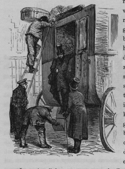 hij; zijne oude beenen op een stoep zettende, en een goeden ruk aan een langen