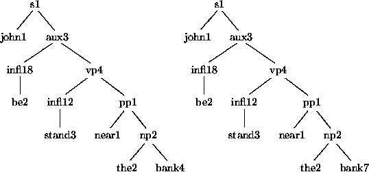 Given a derivation tree t of a generated sentence s, we can now mark the places where the ambiguity occurs as follows. If s is ambiguous it can be parsed in several ways, giving rise to a set of derivation trees T = t1...tn. We can now compare t with the set of trees T in a top-down fashion. If for a given node label in t there are several possible labels at the corresponding nodes in T then we have found an ambiguous spot, and the corresponding node in t is marked. Thus, in the previous example of structural ambiguity we may first generate sentence (6) above. After checking whether this sentence is ambiguous we obtain, as a result, the marked derivation tree of that sentence. A marked node in such a tree relates to an ambiguity. The relevant part of the resulting derivation tree of the example above may be the tree in figure 3.