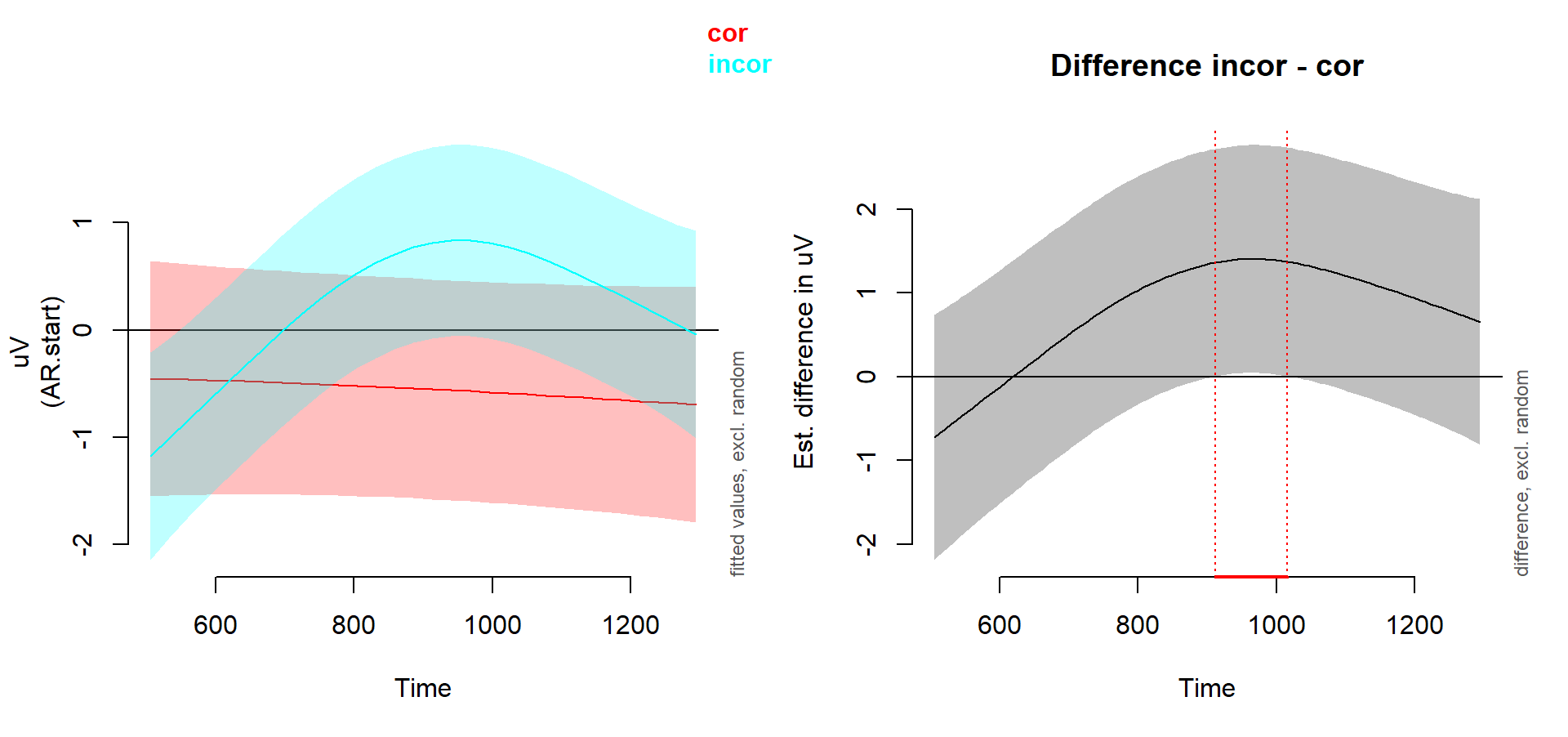 m0b <- bam(uV ~ s(Time) + s(Time,by=IsIncorrect) + s(Time,Subject,bs='fs',m=1) +