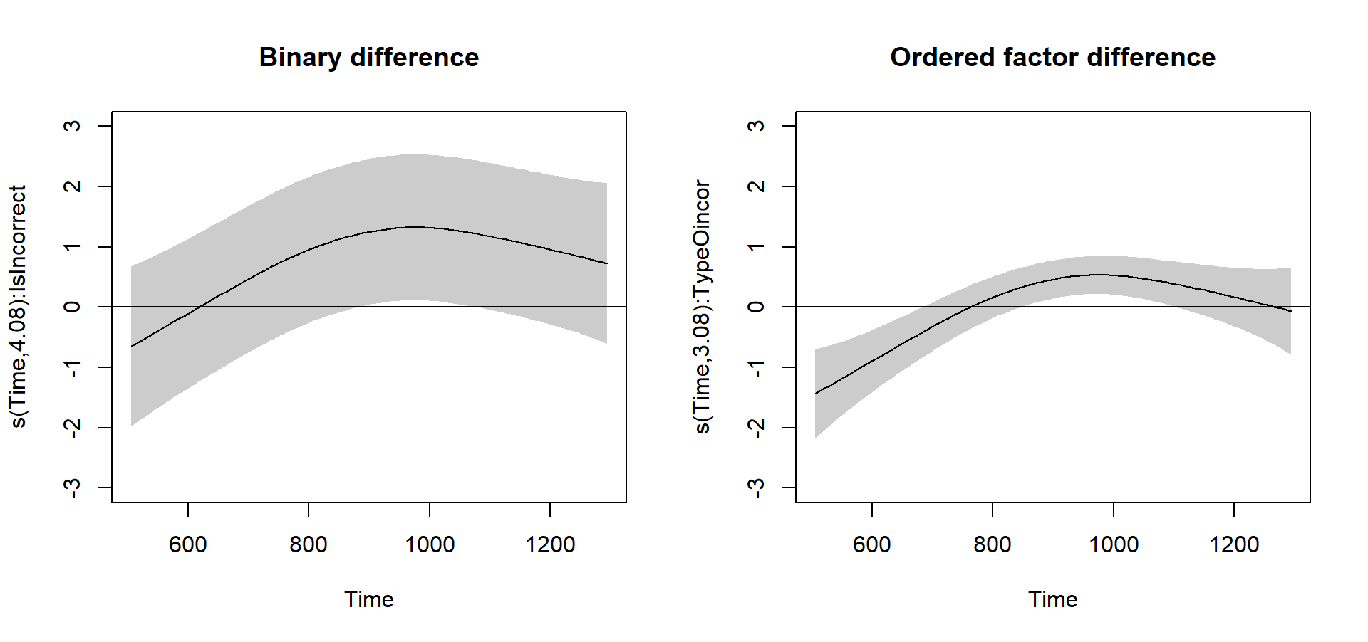s(Time):IsIncorrect shows the significance of the combined intercept and non-linear difference between correct and incorrectdat$TypeO <- as.ordered(dat$Type) # creating an ordered factor ...