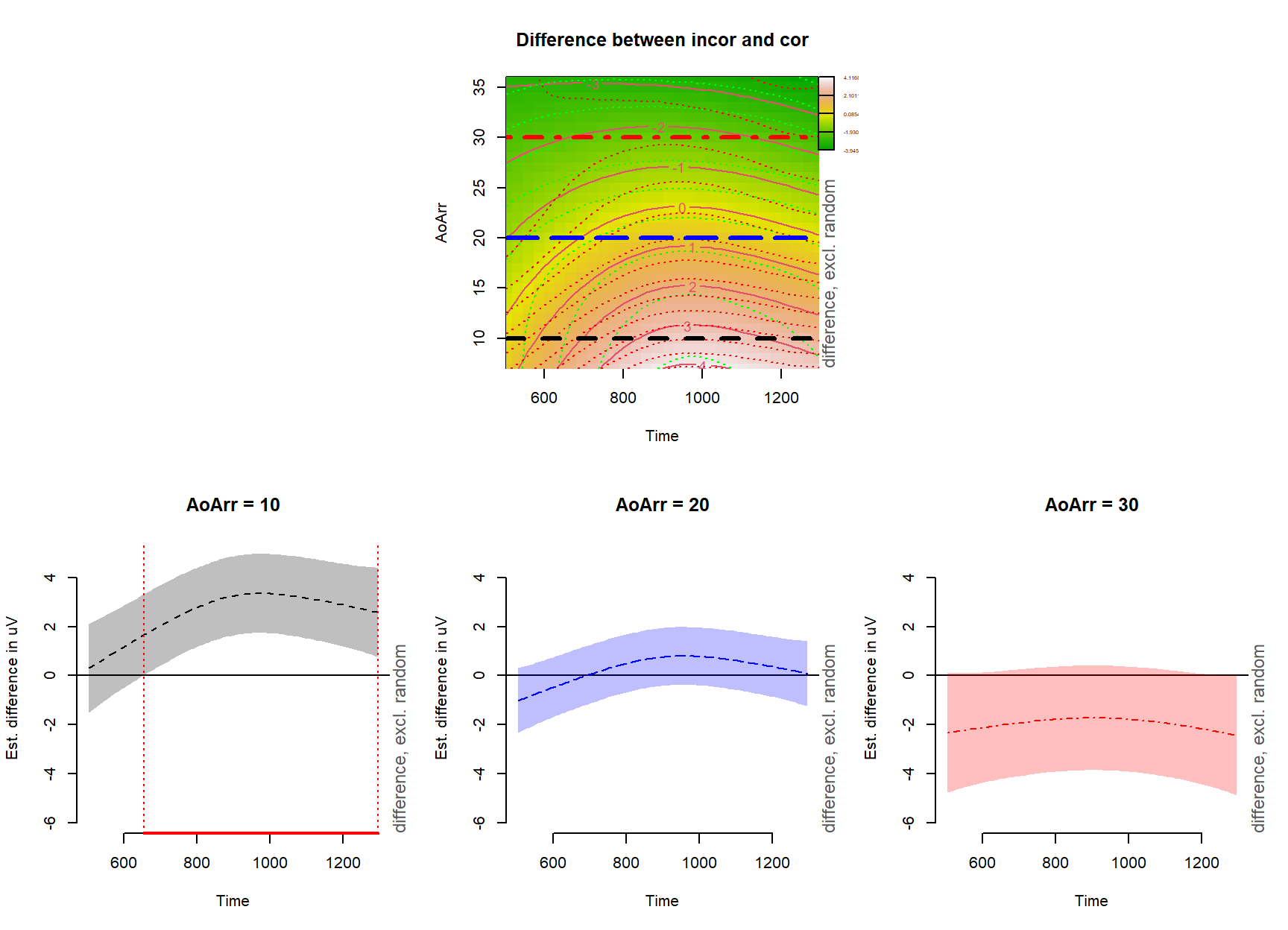m3 <- bam(uV ~ s(Time,by=Type) + s(AoArr,by=Type) + Type + s(Time,Subject,bs='fs',m=1) +