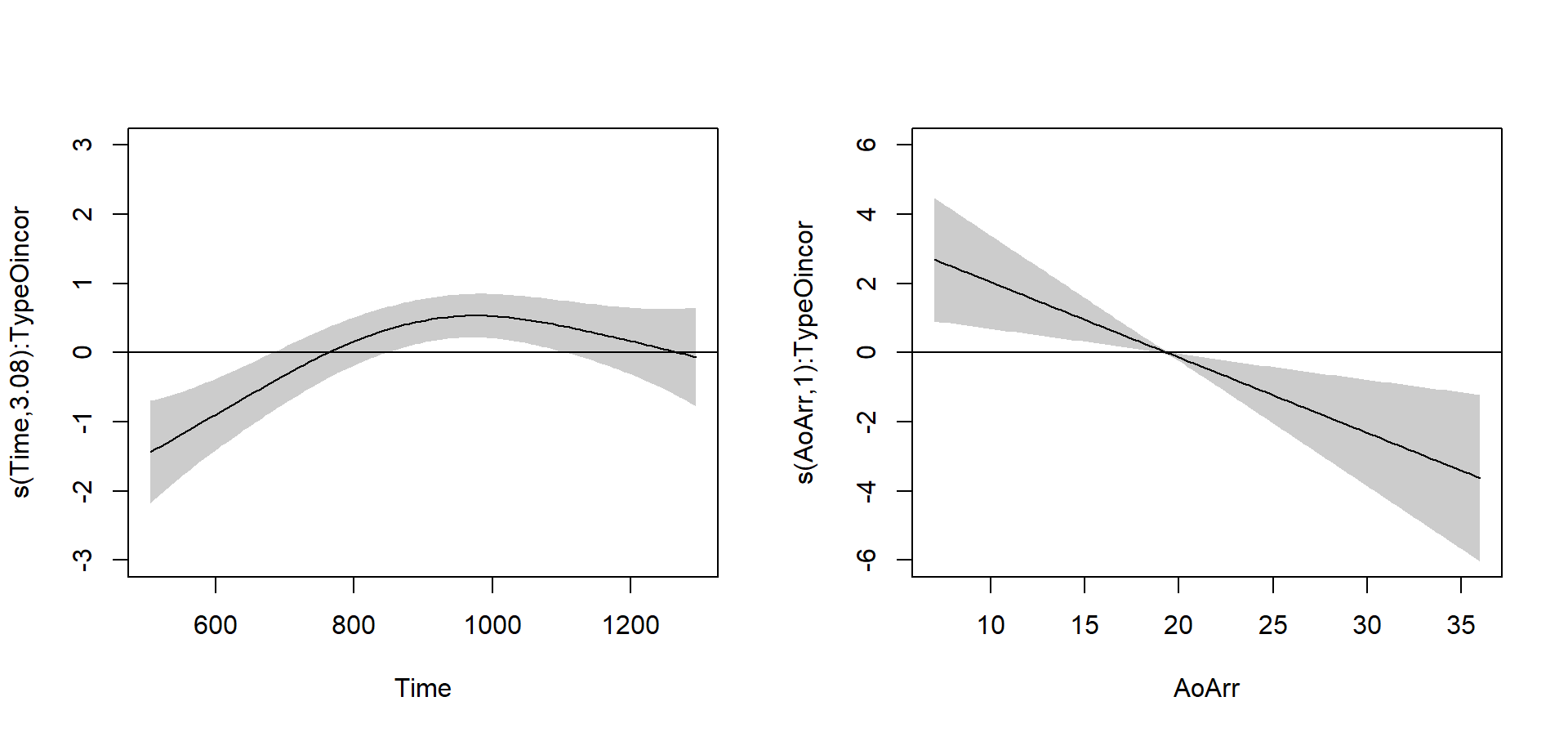 m4 <- bam(uV ~ s(Time) + s(Time,by=TypeO) + s(AoArr) + s(AoArr,by=TypeO) + TypeO +