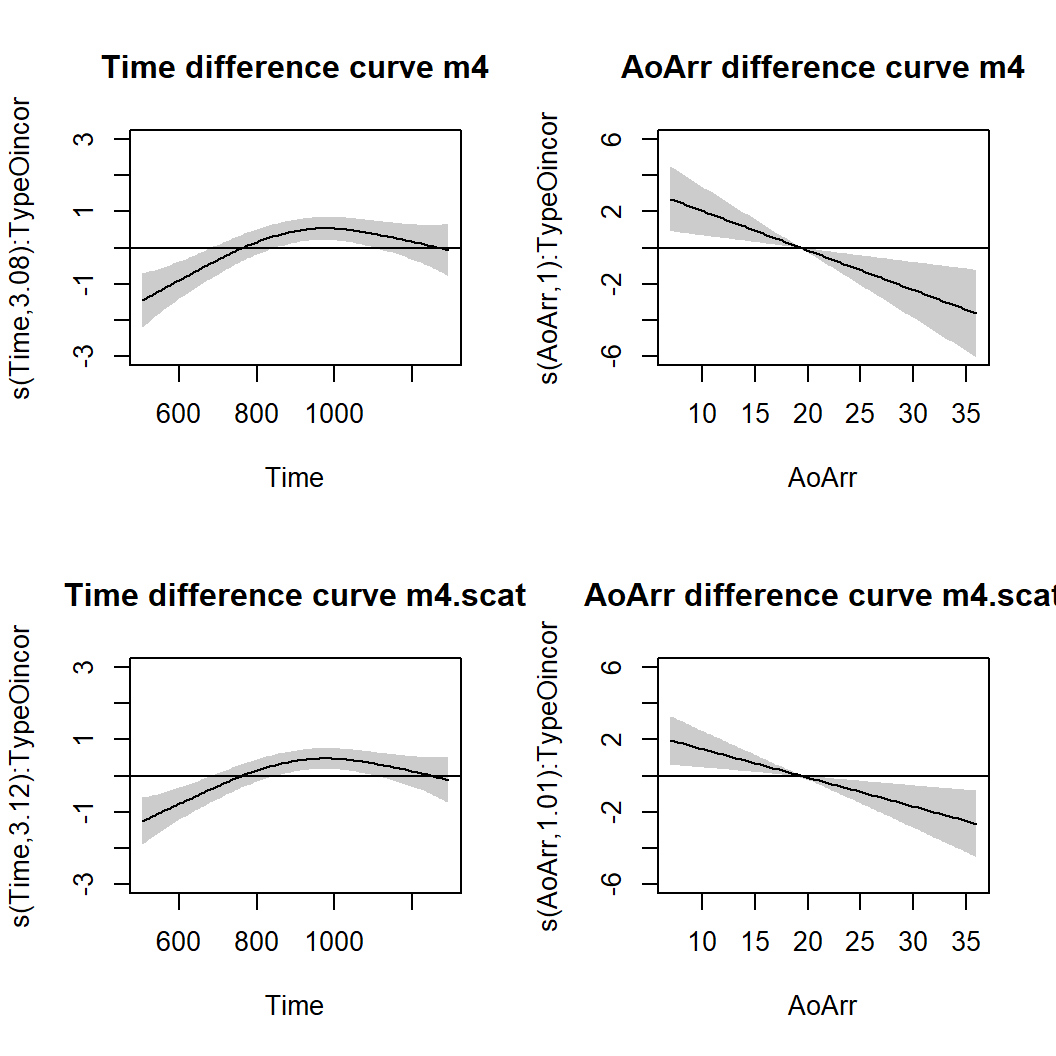 m4.scat <- bam(uV ~ s(Time) + s(Time,by=TypeO) + s(AoArr) + s(AoArr,by=TypeO) + TypeO +