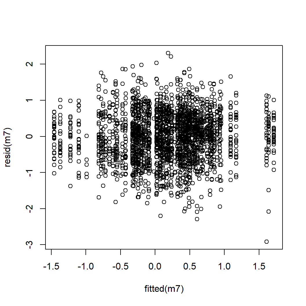 m7 is the best model!lls2 <- lls[ abs(scale(resid(m7))) < 2.5 , ] # trimmed model: 98.5% of original data