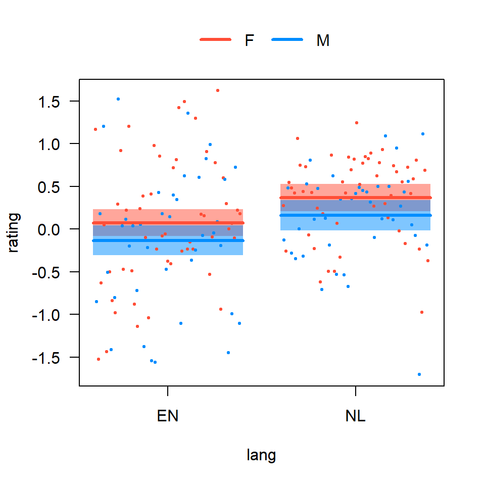 m <- lm(rating ~ lang, data=lls) # (Intercept) is included by default