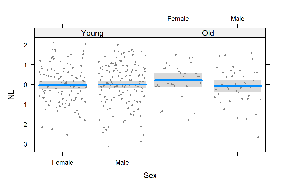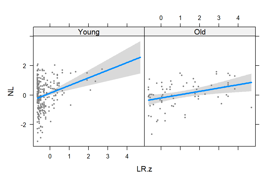 NL = 0.08 + 0.32 * LR.z + -0.37 * AgeGroupOldAgeGroupOld equals 1 for the Old group and 0 for the Young group            Estimate Std. Error t value Pr(>|t|)