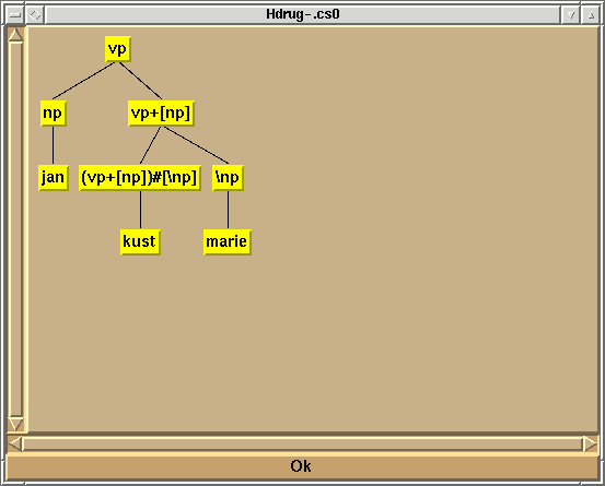 Pressing the left mouse button on an attribute name hides the corresponding value. Pressing the right mouse button on an attribute name brings the corresponding value back on the screen. Alternatively, we can select 2-VIEW-TK-TREE-Q. This also results in a tree to be printed on the canvas, but this time the tree represents the semantic structure of the second parse result. Playing around with the other view possibilities will give you some idea of some of the possibilities of Hdrug. For example, feature structures, trees and Prolog terms can also be output via CLiG or via LaTeX in an Xdvi window. And, of course, you can also get the output to appear in the standard output window (ASCII art).
