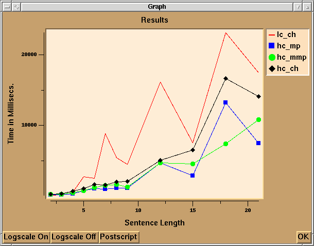 Before we want to conclude that this result indicates that indeed the latter parser is faster, we might want to have some more results. In fact, we could decide to parse all of our sentences, and compare the results of this test-suite. This can be achieved by selecting TEST-SUITE-RUN TEST SUITE. Time for coffee. After some time (depending on the financial situation of your employer) your patience is rewarded and Hdrug has finished this laborious task. We can now obtain some statistical information.