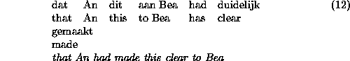 The verb_cluster constraint ensures that cross-serial word order is obligatory for verbs subject to cross_serial. To rule out the ungrammatical (7a), for instance, we assume that Bea kussen is not a verb cluster. The verb kussen by itself, however, is unspecified for VC, and thus (6a) is not excluded.
