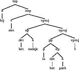 Second, specification of the constituent type is necessary in most cases, especially for disambiguating prepositional phrase attachments. As shown in fig. 4, a noun phrase and a prepositional phrase can form a constituent on different levels. The two phrases can form either a noun phrase or a verbal projection with an empty verb (which is used in the grammar to account for verb second). The first structure corresponds to a dependency structure with a noun phrase internal prepositional modifier, the second corresponds to a dependency tree in which the prepositional phrase is a modifier on the sentence level. Marking the string het meisje in het park as a constituent without further specification does not disambiguate between the two readings: in both readings the string is a constituent. One has to specify that the string should be a noun phrase, not a verbal projection. This specification of the constituent type requires even more knowledge of the grammar. If one specifies a constituent type that cannot be formed at the denoted string position, the parser treats the specification as an illegal character, skips it and generates partial parses only.