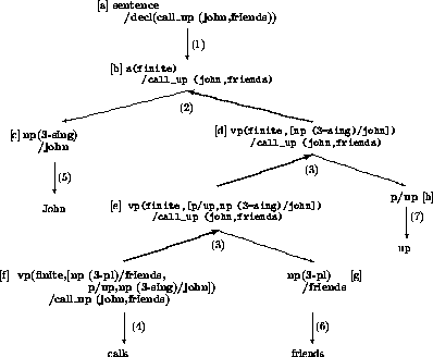 In the implementation, a term of the form node(Cat, P0, P) represents a phrase with the syntactic and semantic information given by Cat starting at position P0 and ending at position P in the string being generated. As usual for DCGs, a string position is represented by the list of string elements after the position. The generation process starts with a goal category and attempts to generate an appropriate node, in the process instantiating the generated string.
