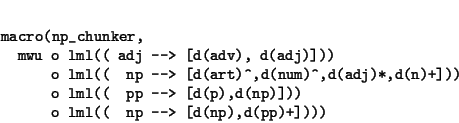 ![\begin{displaymath}\begin{minipage}[t]{.9\textwidth}\begin{verbatim}np --> [d(art)^,d(num)^,d(adj)*,d(n)+]\end{verbatim}\end{minipage}\end{displaymath}](img33.gif) |