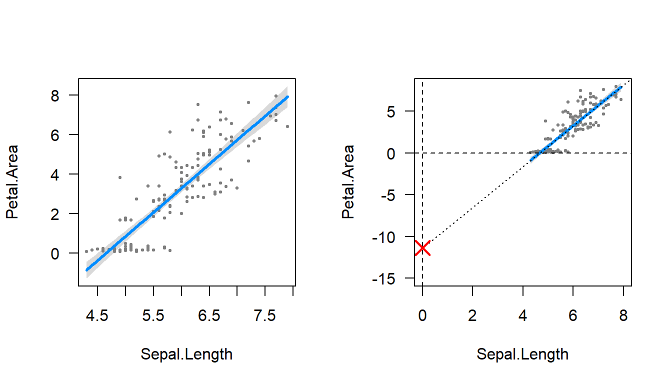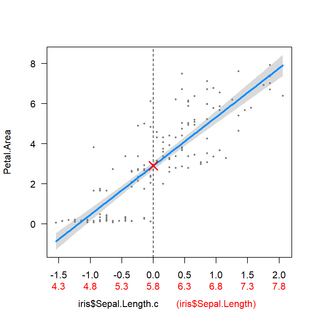 The estimate for the intercept is now more natural: it reflects the value of the dependent variable (petal area) when the predictor (sepal length) is at its average value!