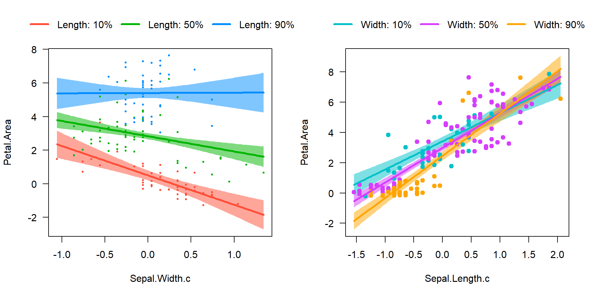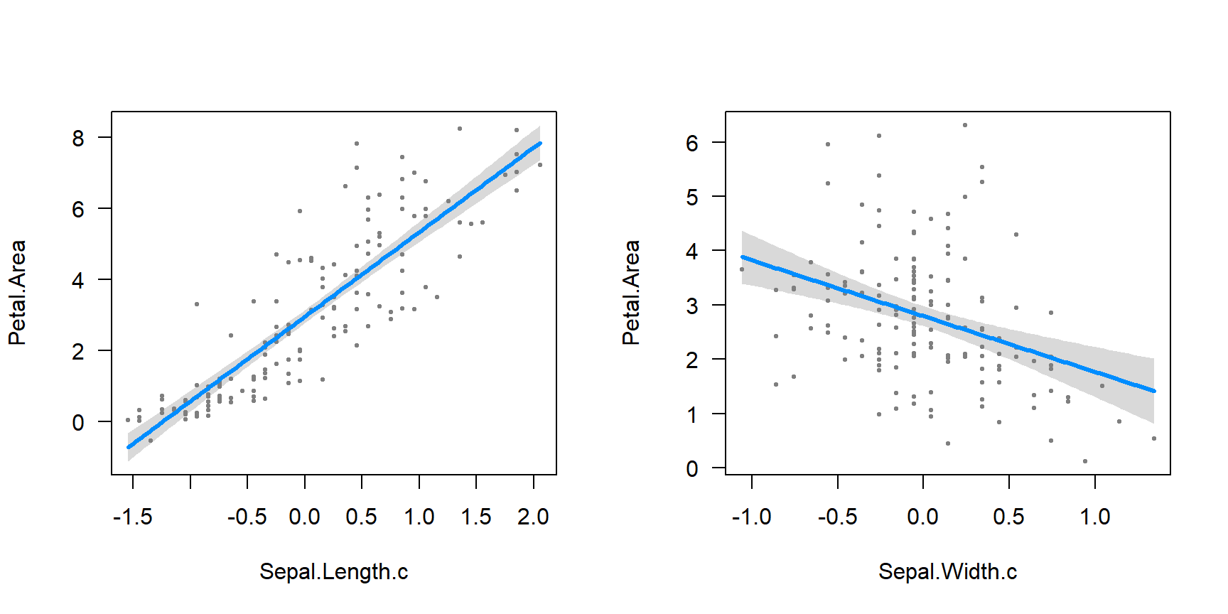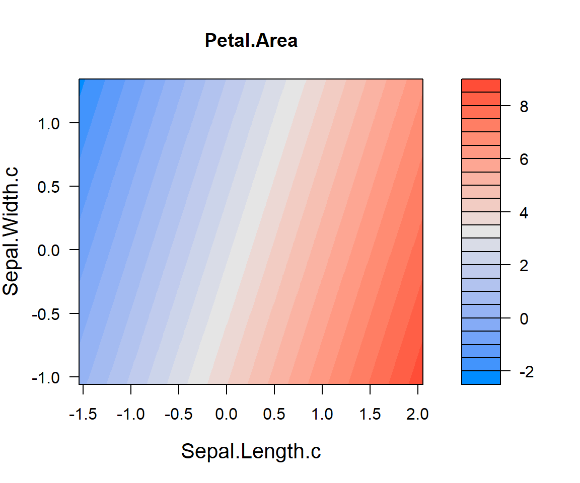 Model 2: Petal.Area ~ Sepal.Length.c + Sepal.Width.c