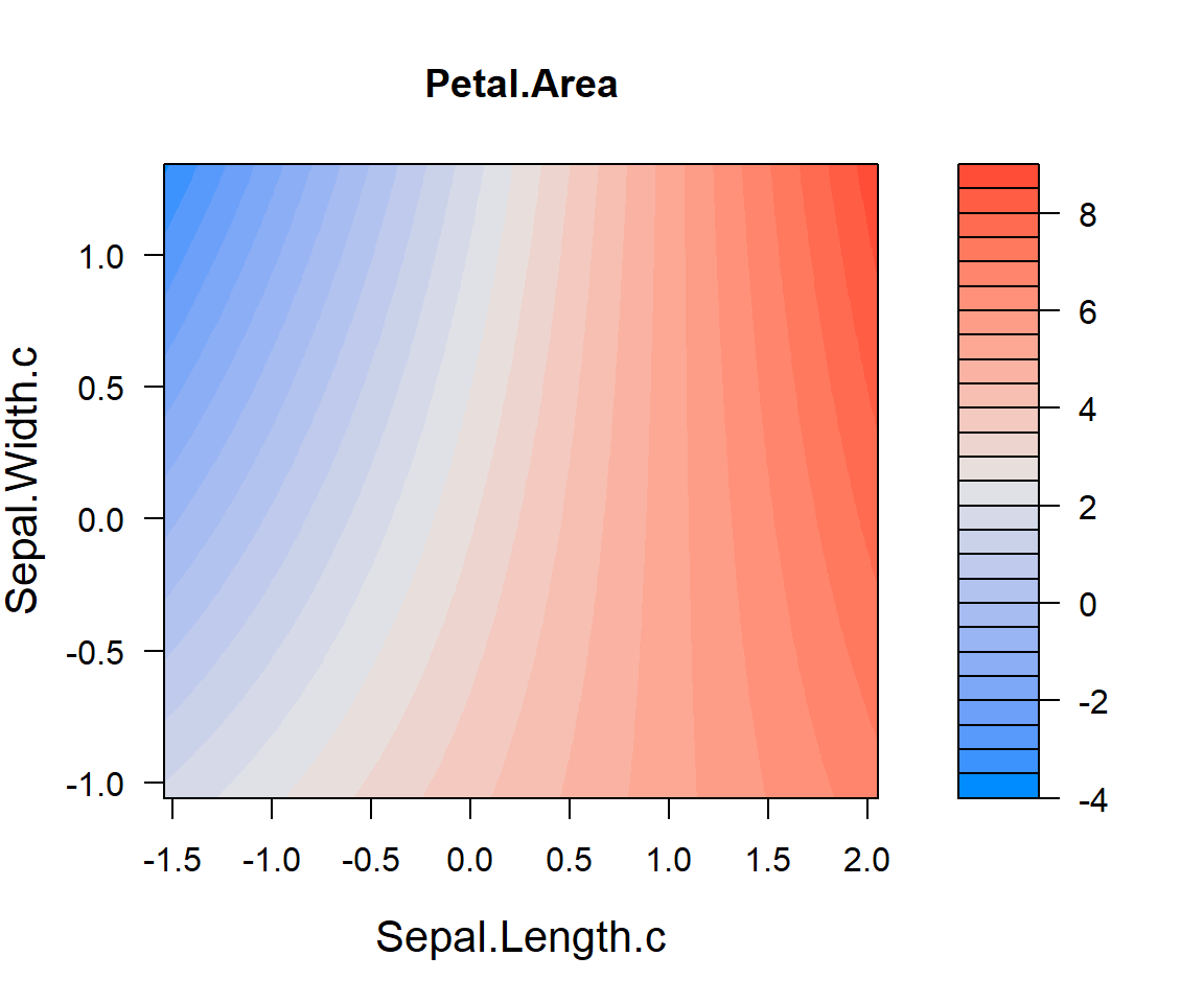 Note that we use centered variables to facilitate interpretation: when both sepal length and width are at their average value, the predicted petal area equals 2.897