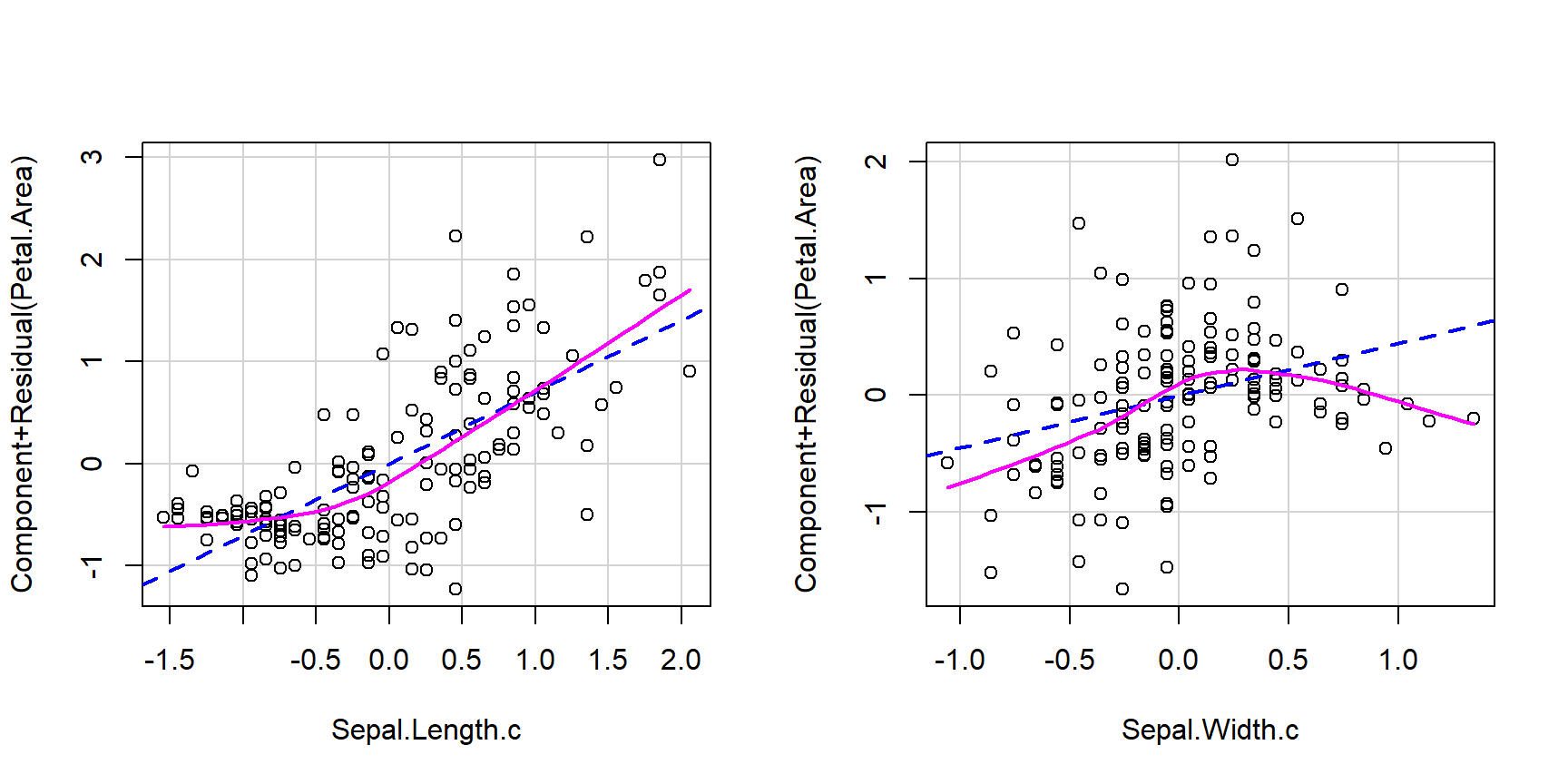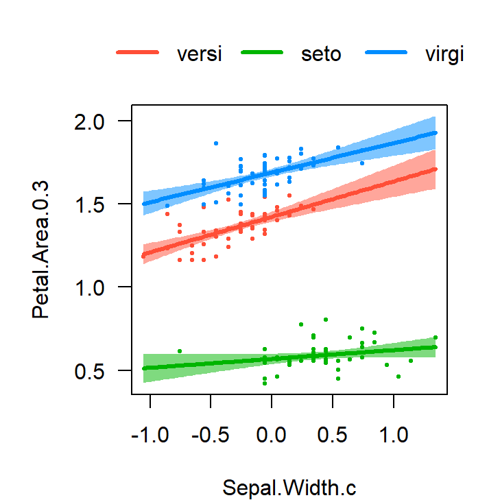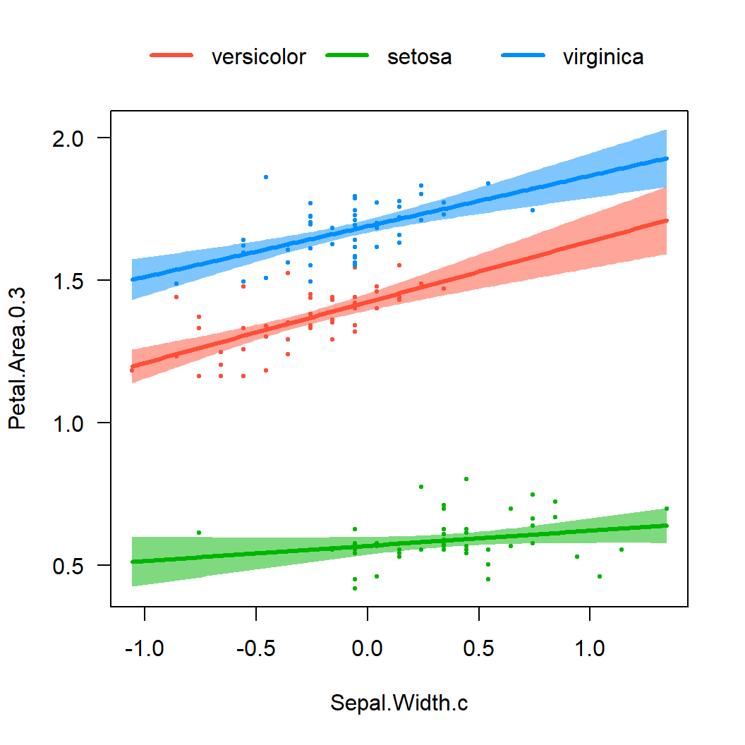 Note that the estimate for Sepal.Width.c is now positive as including Species controls for Setosa irises having the highest sepal width and the lowest sepal area