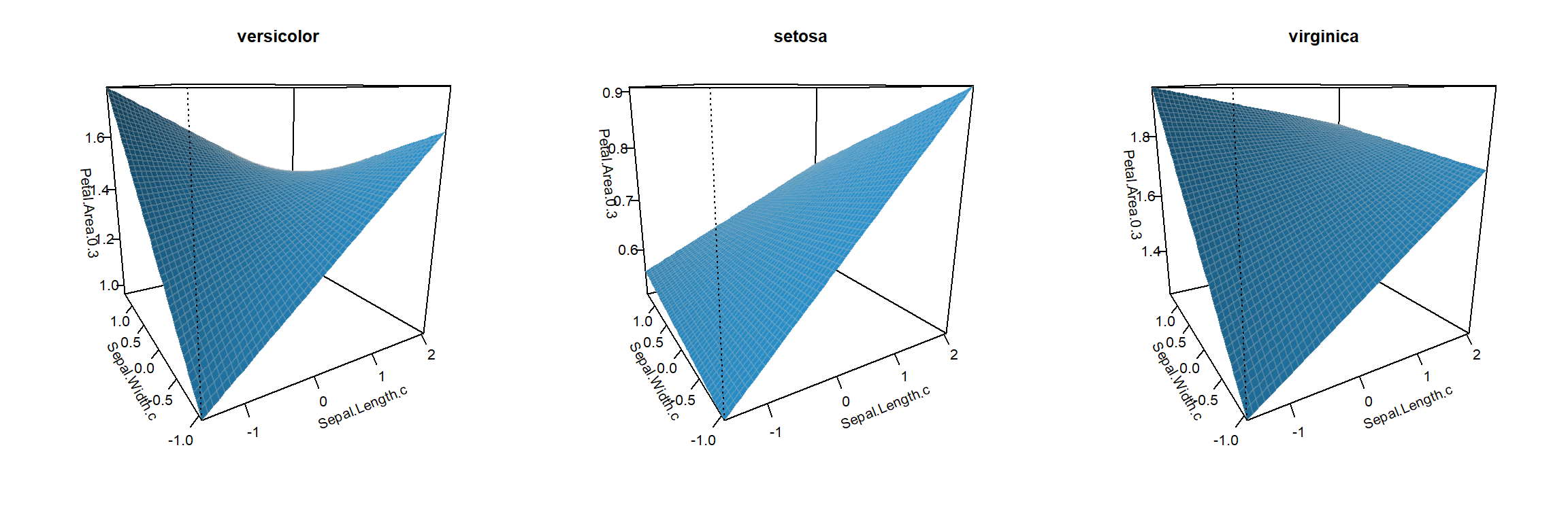 tmp <-lm(Petal.Area.0.3~ Species * Sepal.Length.c * Sepal.Width.c, data=iris) # model used for demonstration purposespar(mfrow=c(1,3))visreg2d(tmp, 'Sepal.Length.c', 'Sepal.Width.c', cond=list(Species='versicolor'), plot.type='persp', main='versicolor', nn=50)visreg2d(tmp, 'Sepal.Length.c', 'Sepal.Width.c', cond=list(Species='setosa'), plot.type='persp', main='setosa', nn=50)visreg2d(tmp, 'Sepal.Length.c', 'Sepal.Width.c', cond=list(Species='virginica'), plot.type='persp', main='virginica', nn=50)