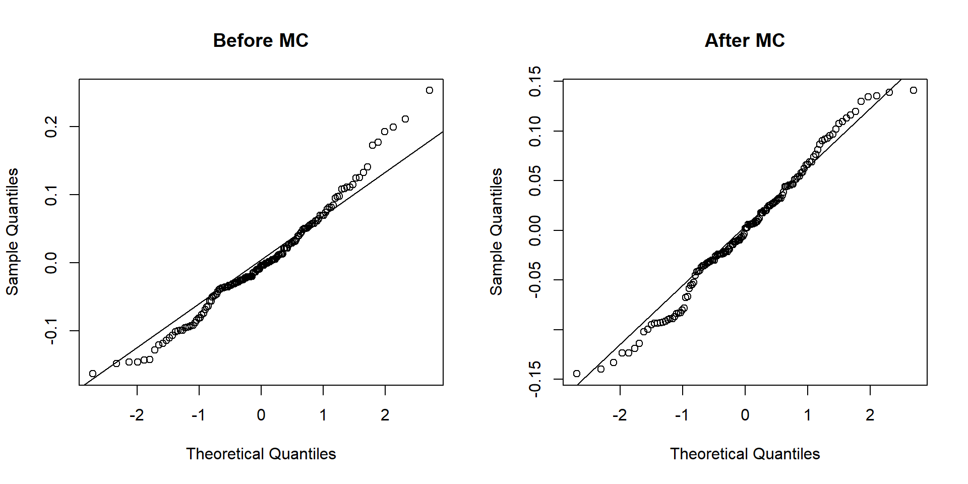 Distribution of residuals before and after MC