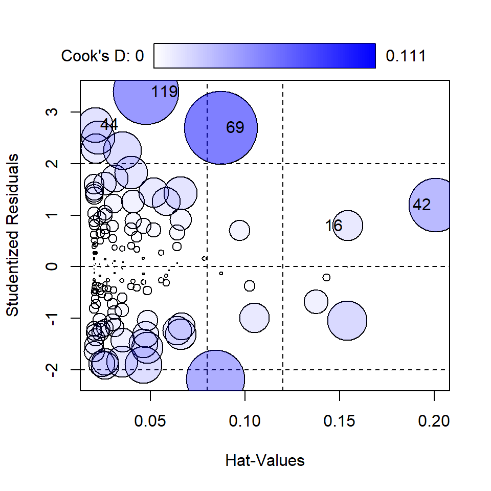 # x-axis: hat values (leverage) - amount of influence a predictor has on fitted values# y-axis: standardized residuals# circle size: Cook's distance - effect of removing observation on coefficients & fitted values# influential outliers: those with large absolute residuals and large Cook's distanceoutliers <-influencePlot(bestmodel) # from library(car)