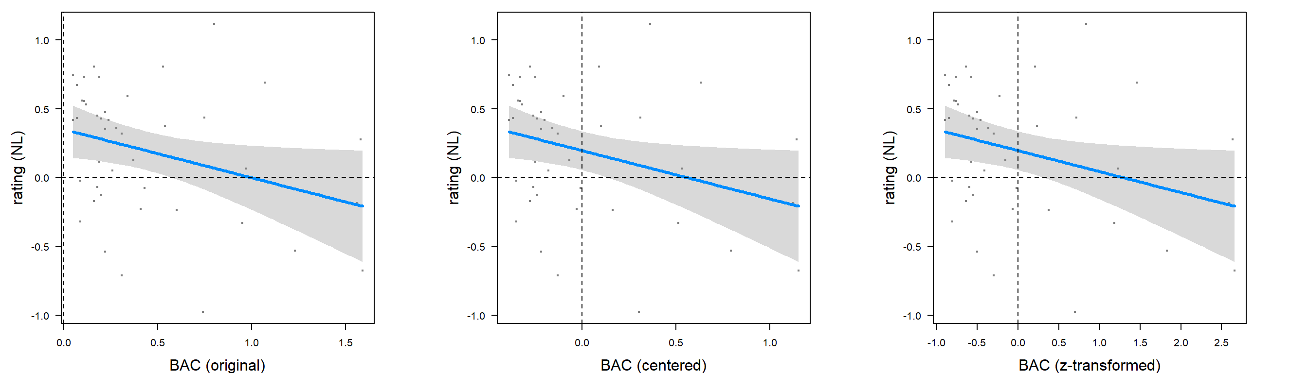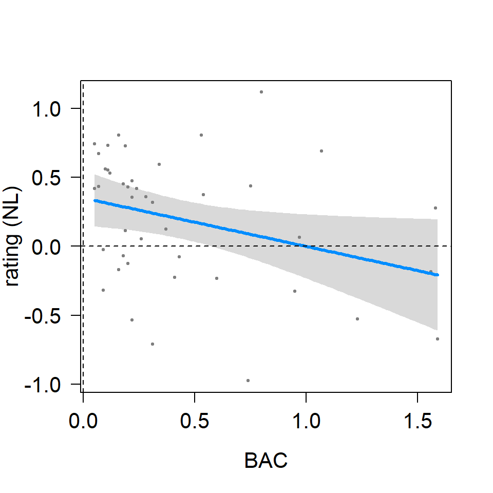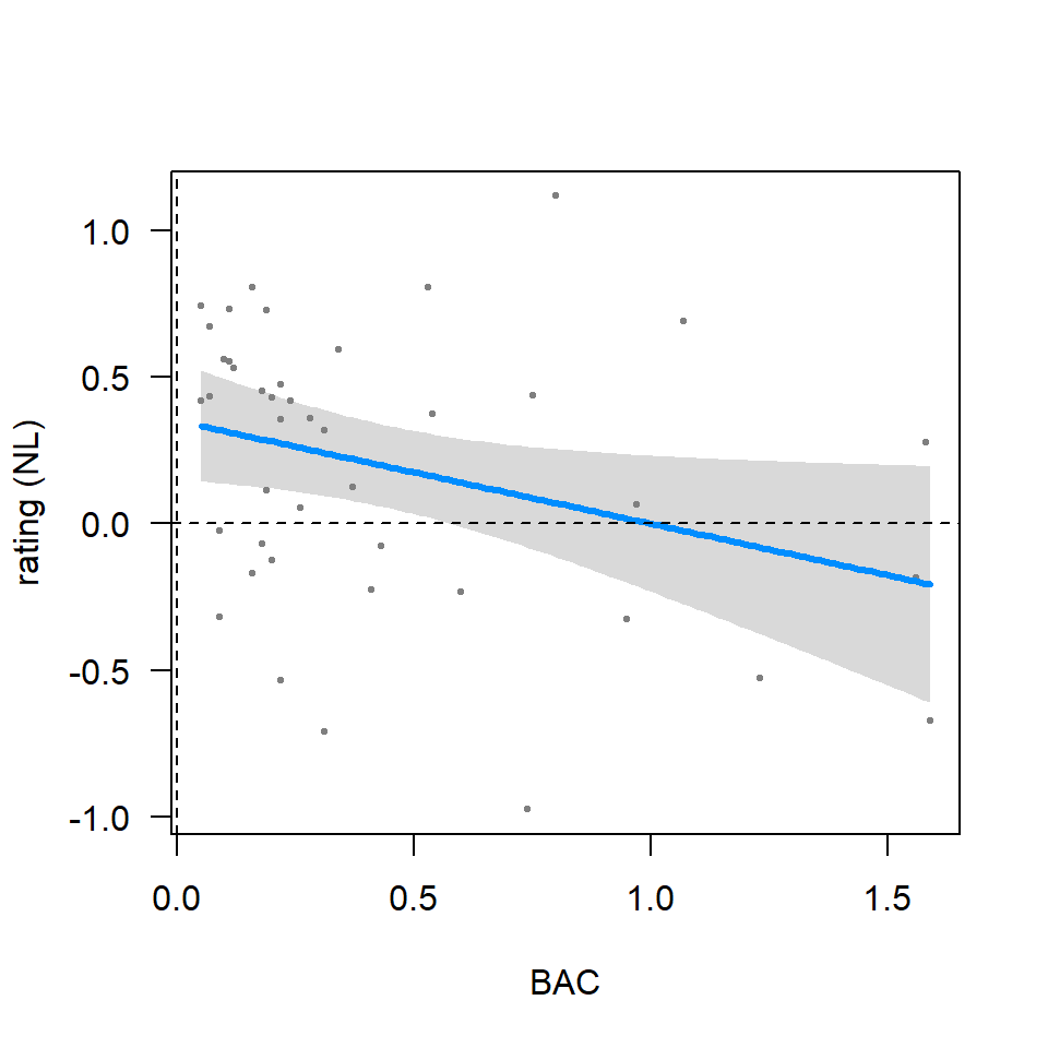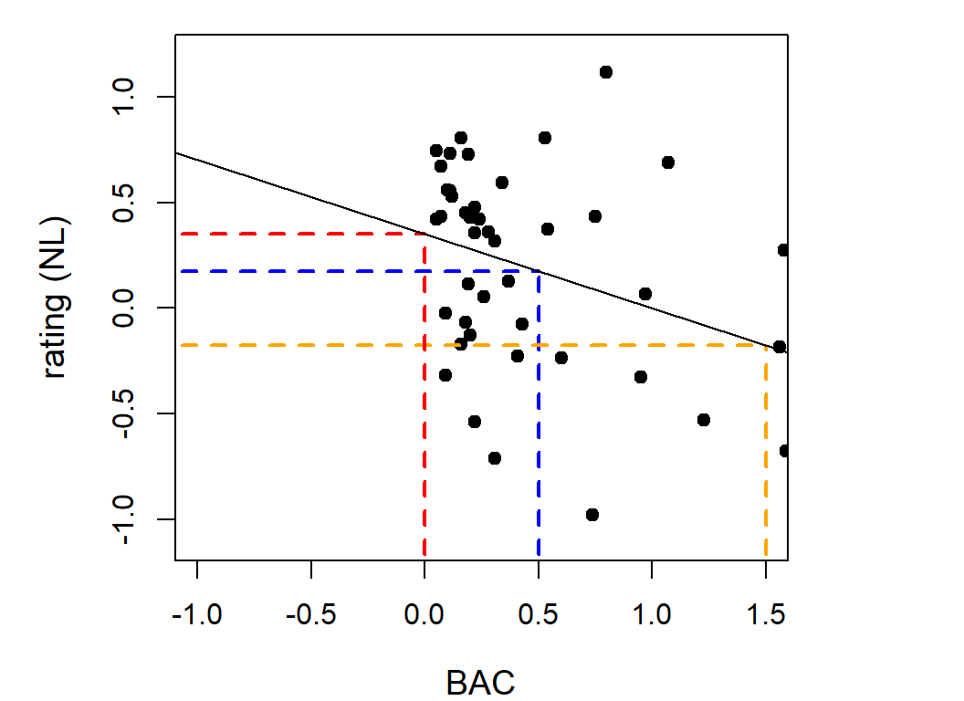 BAC of \(0\) fitted ratingNL of: \(0.35 +\,\) \(-0.35\, *\) \(0\) \(=\) \(0.35\) (= Intercept)BAC of \(0.5\) fitted ratingNL of: \(0.35 +\,\) \(-0.35\, *\) \(0.5\) \(=\) \(0.175\)BAC of \(1.5\) fitted ratingNL of: \(0.35 +\,\) \(-0.35\, *\) \(1.5\) \(=\) \(-0.175\)