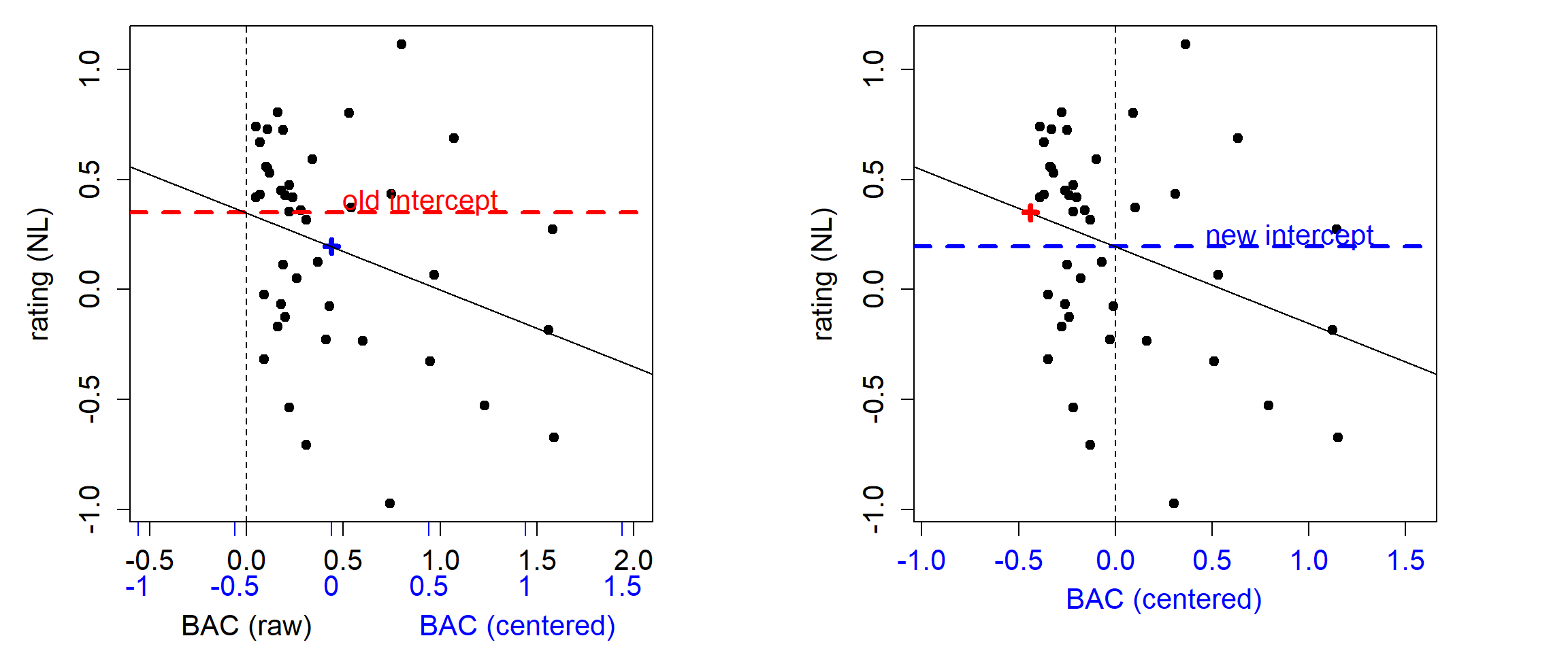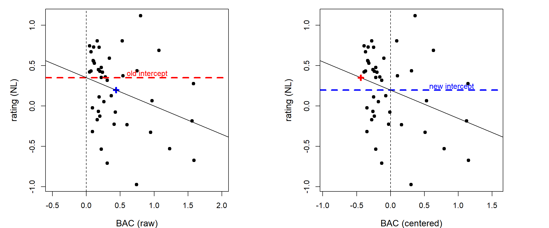 summary(mc <- lm(ratingNL ~ BAC.c, data=lls))$coef # results with centered BAC Estimate Std. Error t value Pr(>|t|)
