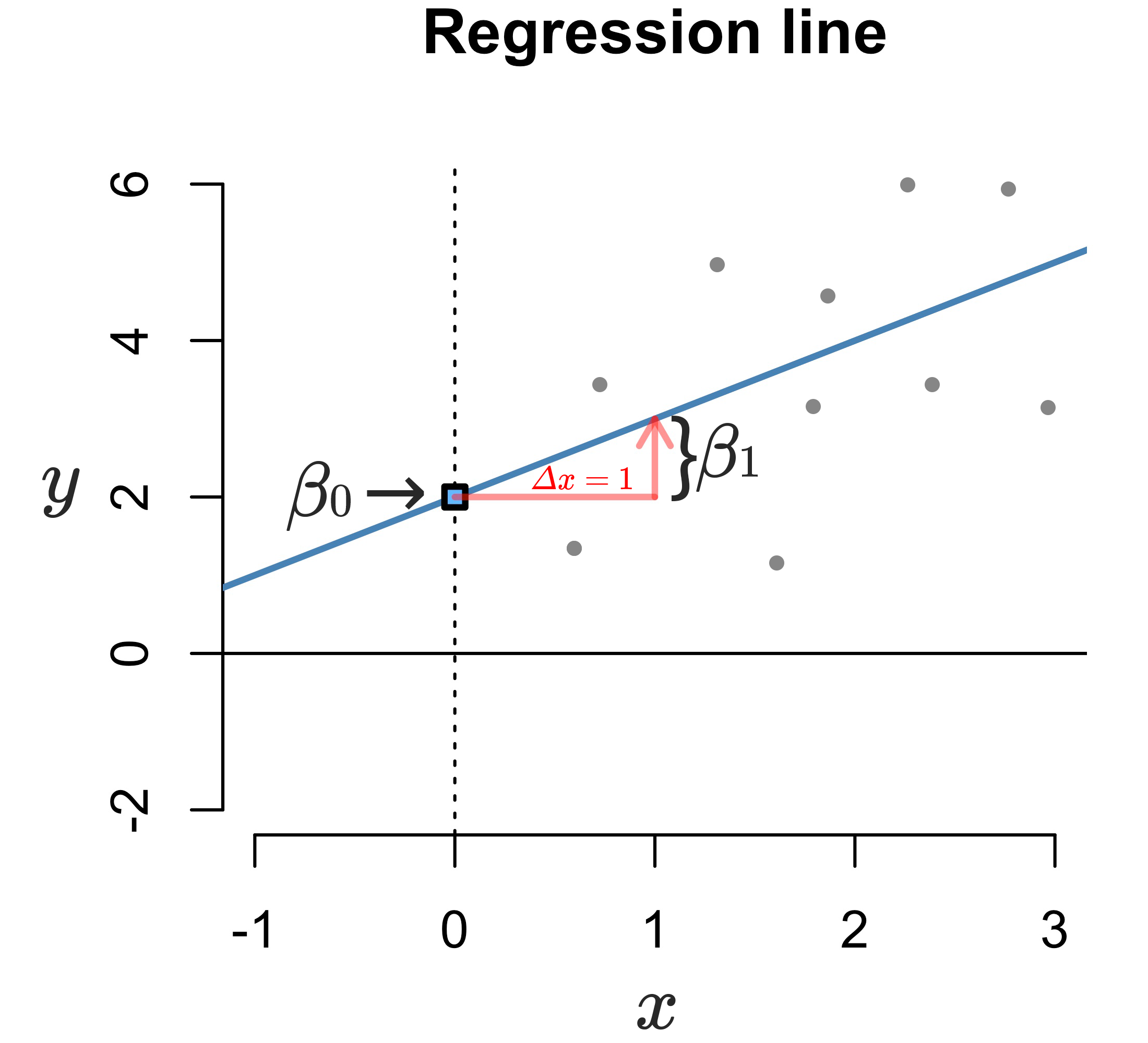 Suppose \(\beta_0 = 2\) and \(\beta_1 = 1\), then regression formula equals: \(y = 2 + 1 \times x\)