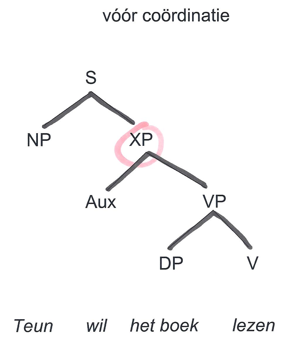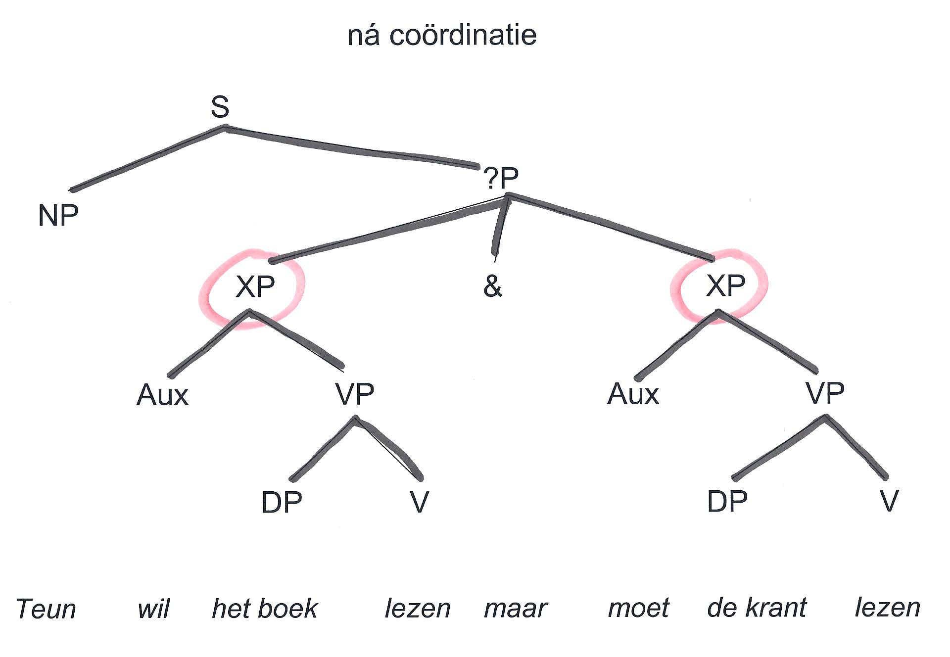 In de structuur van de zin is Teun een zuster van constituent 1 en constituent 2 A heeft bereik over D als D (een onderdeel van) de zuster is van A